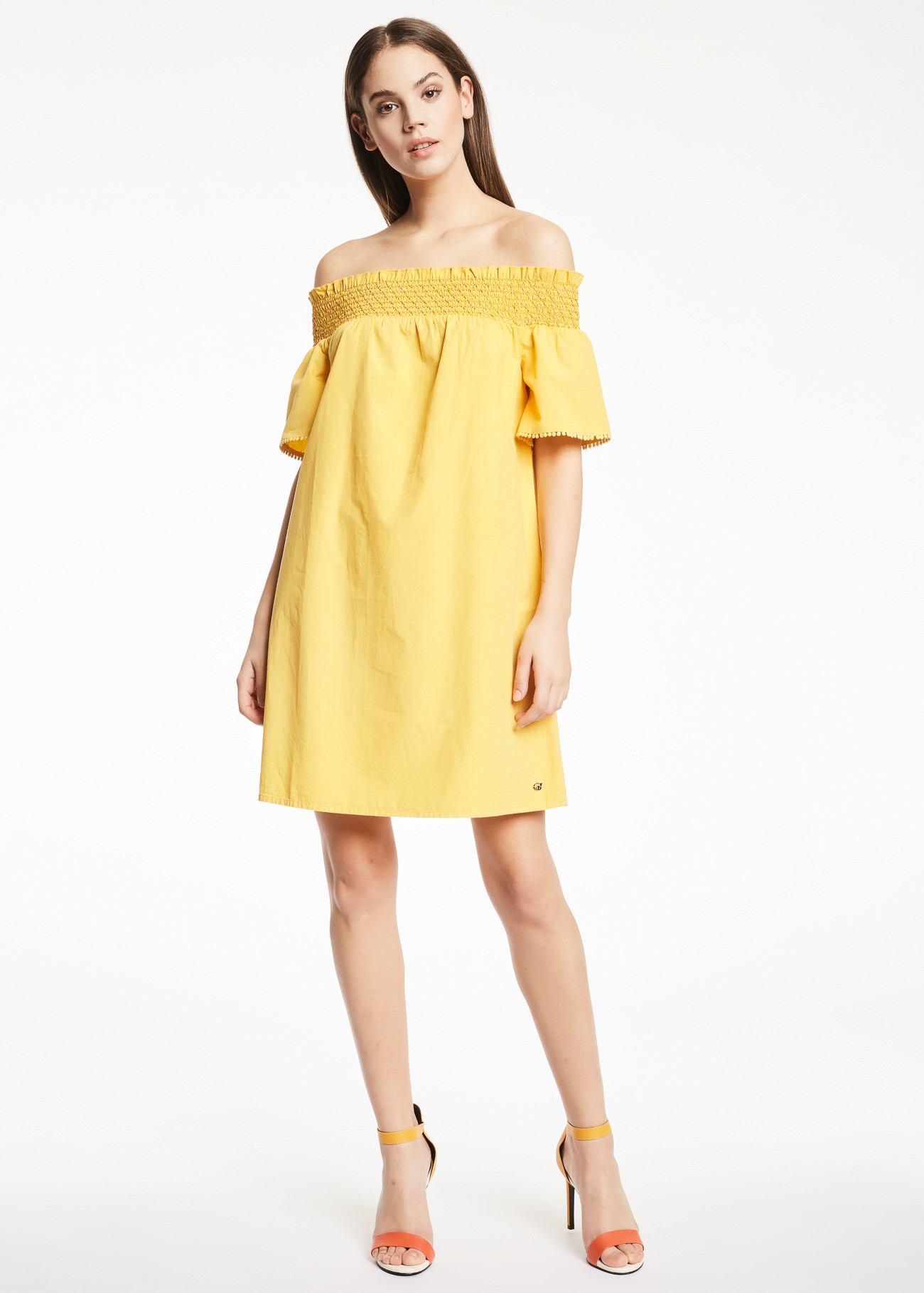 Abito dalla linea ampia realizzato in puro cotone. Il modello ha scollatura off the shoulder, maniche corte e logo applicato al fondo.